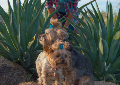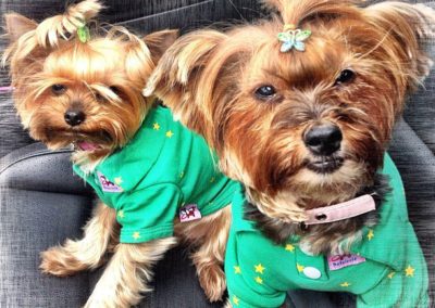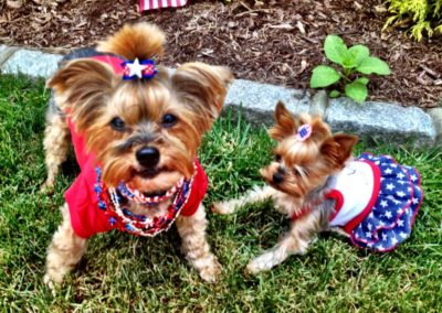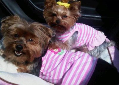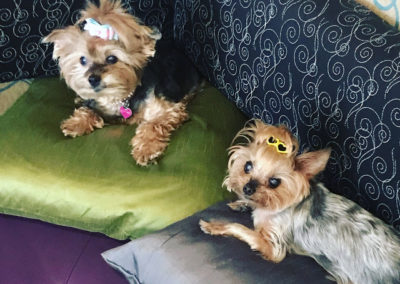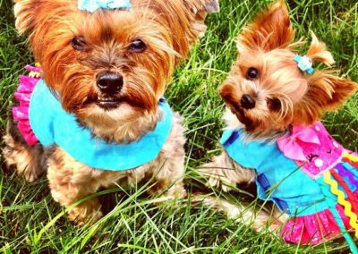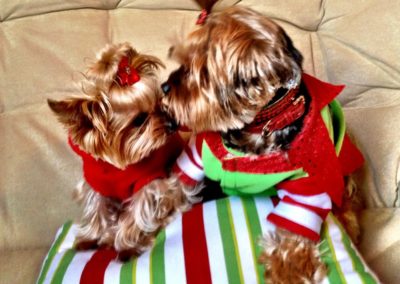 Jolie is a teacup sized Yorkshire Terrier born on August 2, 2006. She is a super spoiled alpha dog. Her big sis, Bebe thought she was the alpha until she arrived and a few nibbles to her ear quickly changed her mind. Jolie loves playing dress-up and getting her hair done. She especially loves getting combed, as it seems to really relax her! Jolie knows a few tricks but prefers looking cute and sleeping in the sunshine instead. Her favorite toys are the small plush one with the squeakers in them from Kong. She also loves to steal toys from Bebe!